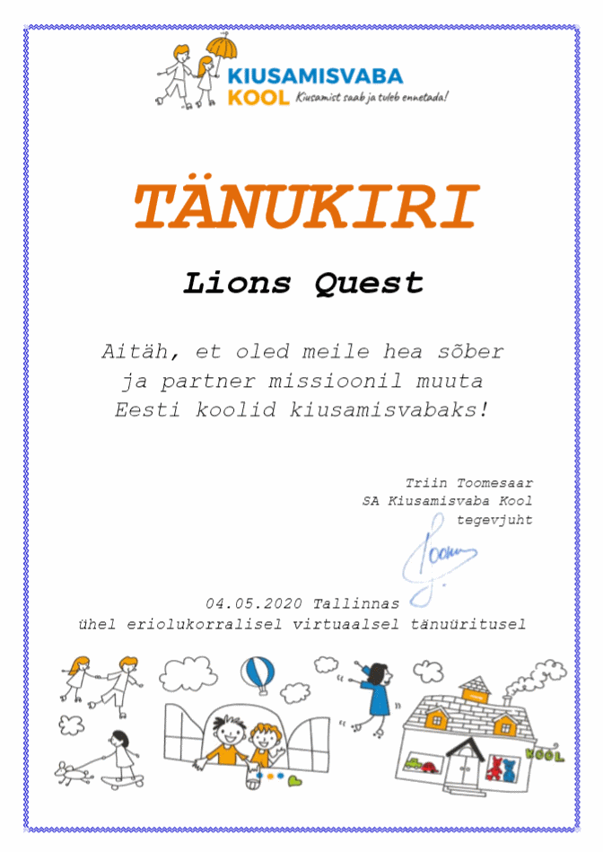 Kiusamisvaba kooli projektitiim ja kogu KiVa-koolide võrgustik tänavad PDG Raivo Kokserit ja Eesti Lions Piirkonda virtuaalse kallistuse, tugeva aplausi ja soojade tänusõnadega koostöö eest missioonil muuta Eesti koolid kiusamisvabaks!